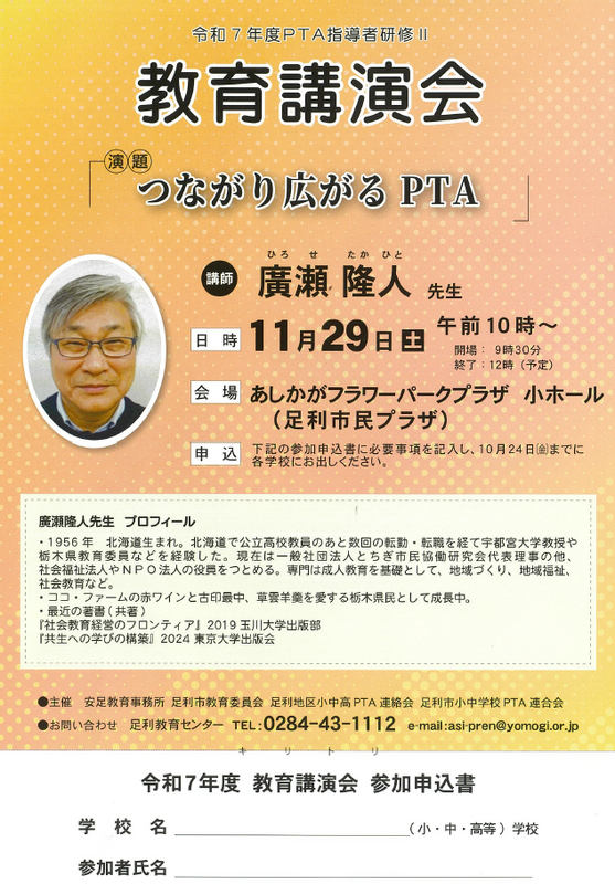 受講を希望される方は、足利市内小中学校PTA会員様は、各学校へお申し込みください。