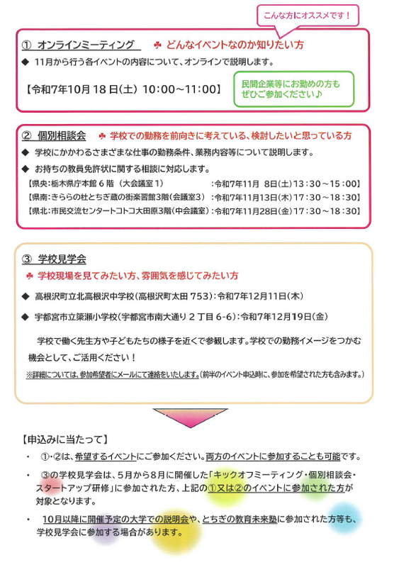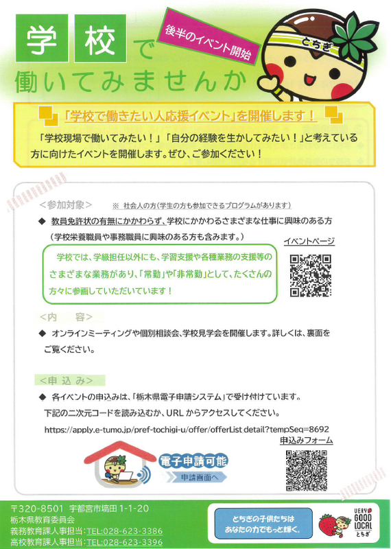 栃木県教育委員会より「教職員人材確保に向けた取組に係る参加者募集」にチラシが届きましたので掲載いたします。ご一読ください。