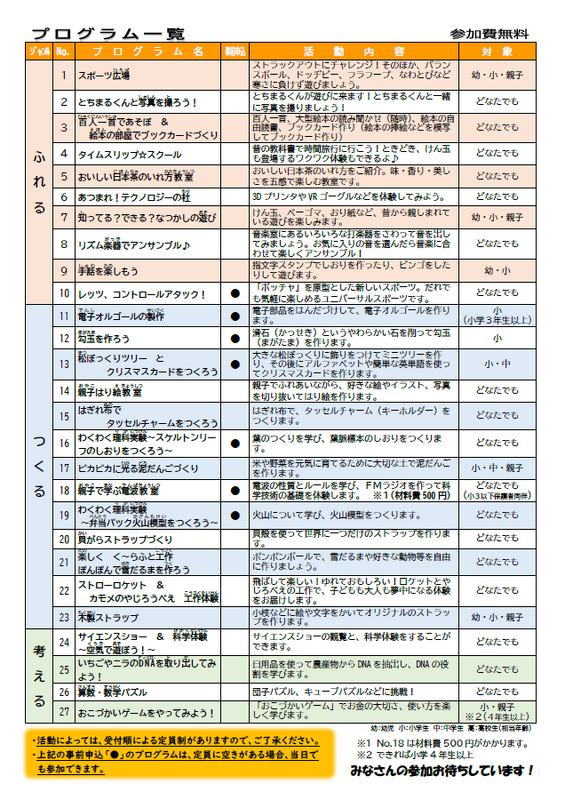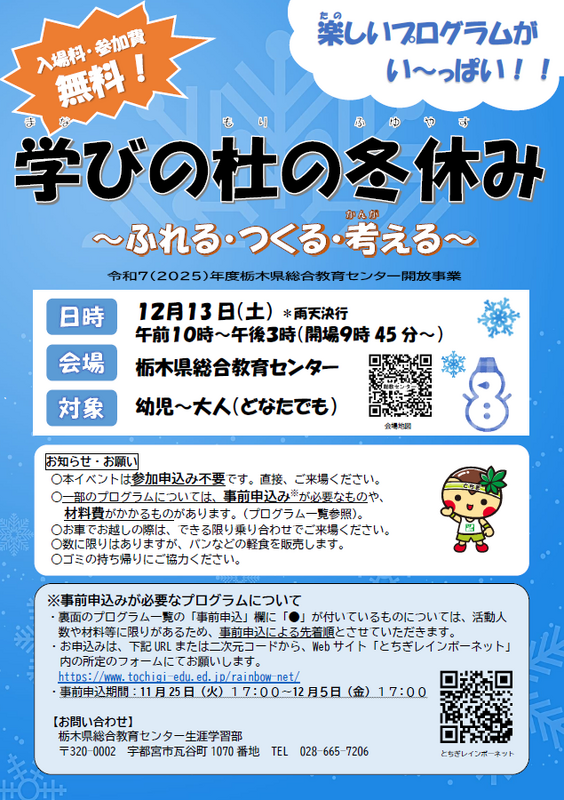 栃木県総合教育センターより、「学びの杜の冬休み ~ふれる・つくる・考える~」のイベント案内が届いております。
