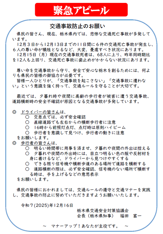 栃木県交通安全対策協議会会長より、標記の案内がありました。