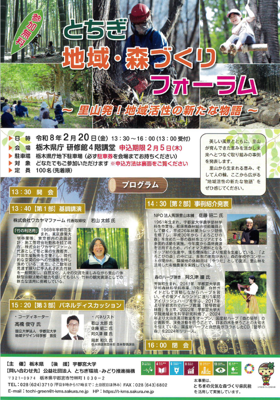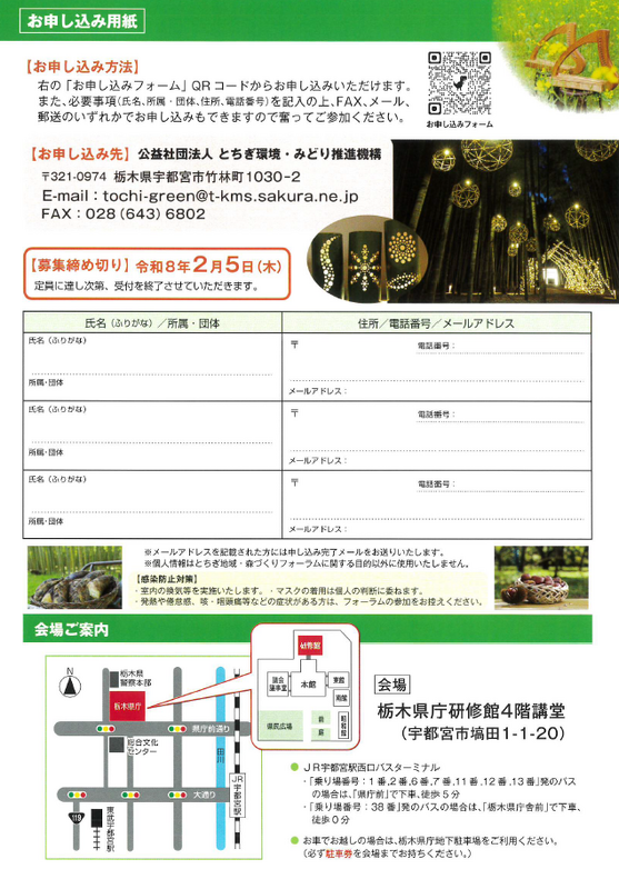 栃木県環境森林部(とちぎの元気な森づくり県民会議事務局)森林整備課より、標記のフォーラムの案内が届いております。本会は「とちぎの元気な森づくり県民会議」の構成団体として所属しております。