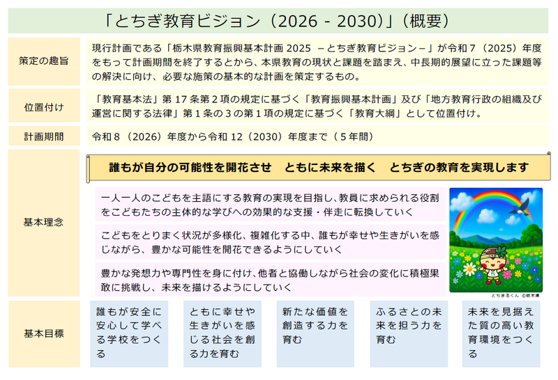 栃木県教育委員会より「とちぎ教育ビジョン(2026-2030)」の策定について通知がありました。
